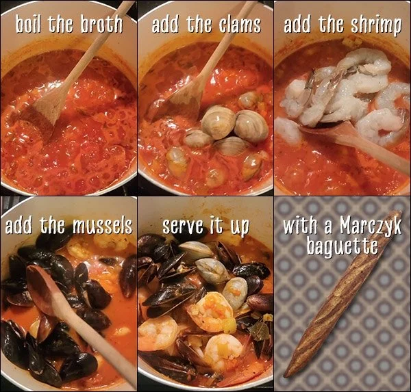 The above images are from a video that features Chef Jamey Fader showing the world when to add each ingredient. Along with eating, timing is your biggest concern when it comes to cioppino, and it's hardly a concern at all. This future-Pulitzer-Prize-winning video (in the "Best Cioppino Documentary" category) will tell you everything you need to know to prepare this beautifully uncomplicated yet hugely flavorful meal.
