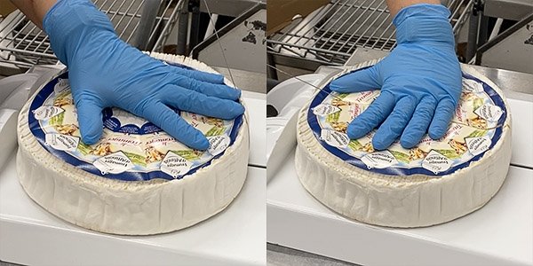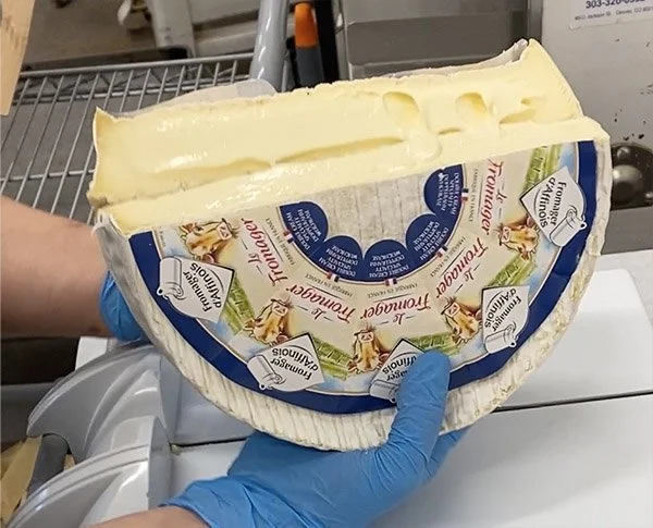 We receive many of our cheeses in big wheels or blocks that we break down ourselves. Below is a future-prize-winning photo essay that shows you how we prepare many of our cheeses, and we'll be demonstrating with a soft French cheese that has been a favorite for years.